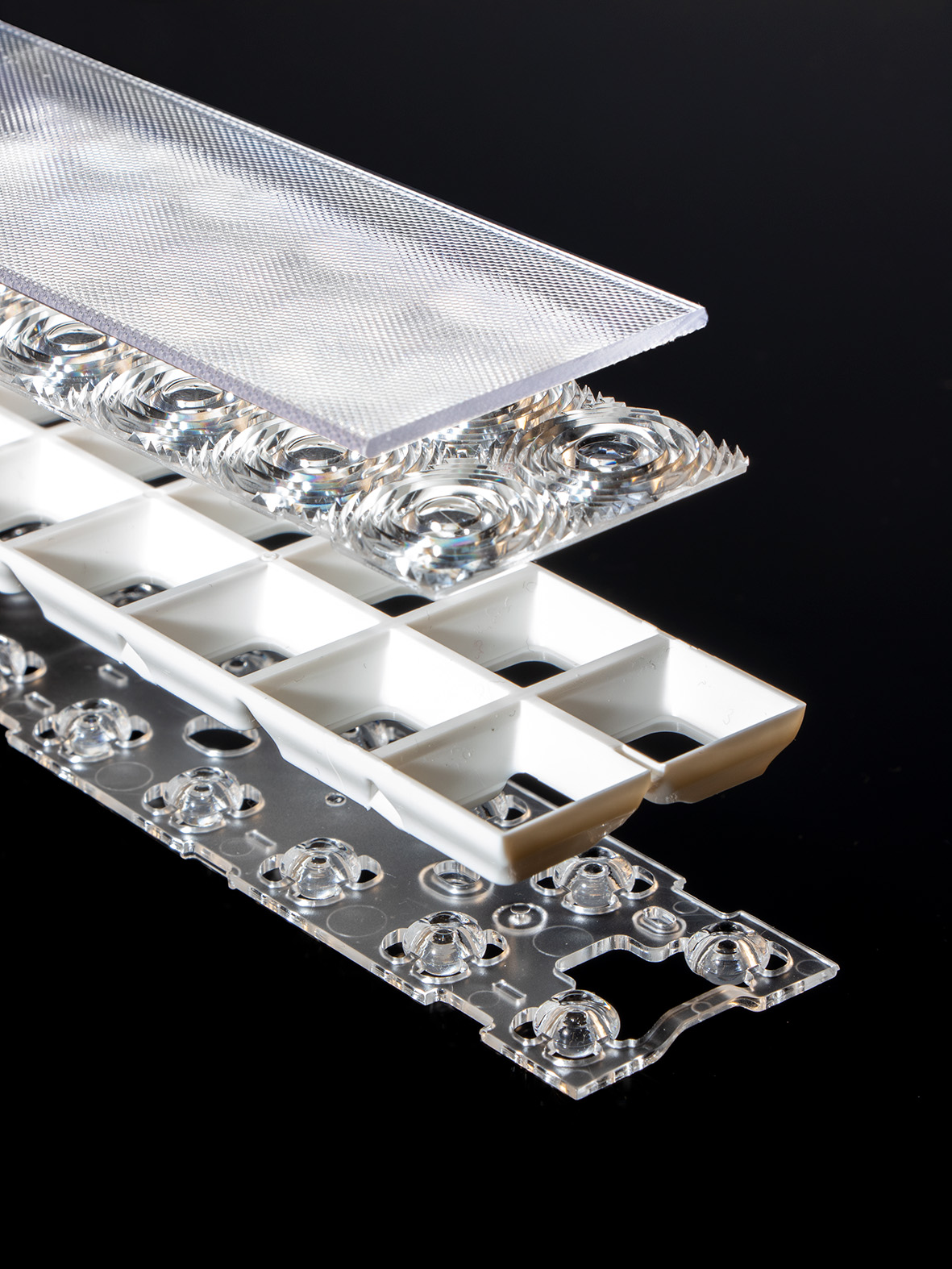 The first microprismatic lens offering precise optical control and delivering up to 4000 lm/m with UGR < 19 in an exceptionally compact form factor, available in 1‑foot increments. It provides glare‑free, comfortable illumination with reduced surface brightness, enabled by LEDiL’s proprietary optical design. Compatible with Two-row PCB modules with 3030 and 2835 LEDs.